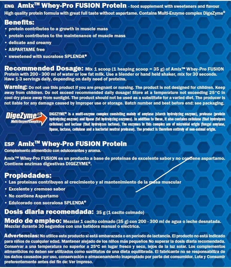 Ингредиенты:Whey-Pro Fusion 1:1 Protein Complex 80% (ультрафильтрованный низкотемпературный обработанный инстантизированный концентрат сывороточного протеина /из молока/, CFM® - микрофильтрованный сывороточный протеиновый изолят /из молока/ с белковыми фракциями [бета-лактоглобулин, альфа-лактоглобулин, сывороточный альбумин, иммуноглобулин, гликомакропептид, лактоферрин, лактопероксидаза]); стабилизатор: гидролизат коллагена, мальтодекстрин, какао-порошок (только во вкусах: шоколад, шоколад-кокос, арахис-шоко-карамель, мока-шоко-кофе); эмульгатор: соевый лецитин; ароматизатор, стабилизатор: карбоксиметилцеллюлоза натрий; подсластители: сукралоза Splenda® и ацесульфам-К; краситель: (аромат банана и пина колады – куркумин; яблоко и корица, дыня-йогурт и фисташки: медные комплексы хлорофилла), экстракт свеклы (только в ароматах клубники, лесных фруктов и пинаколады); запатентованный пищеварительный фермент DigeZyme® – мультиферментный комплекс (амилаза, липаза, лактаза, целлюлаза, бактериальная нейтральная протеаза); какао-порошок (только в ароматизаторах: печенье крем, двойной белый шоколад), хлорид натрия.