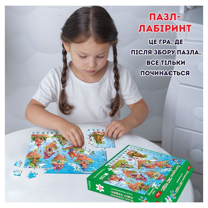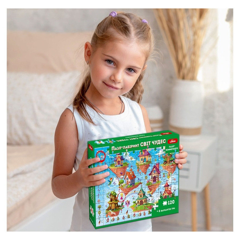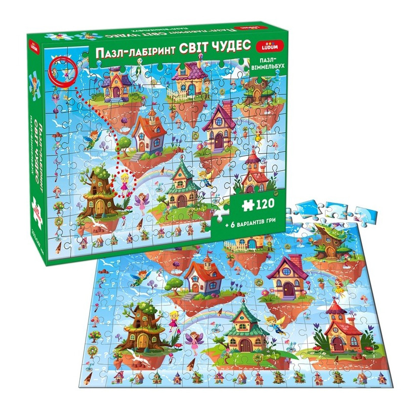 Пазл-Віммельбух Лабіринт Світ чудес - це гра, де після збирання пазла все тільки починається! Малюнок цікавий, з великою кількістю деталей. Пазл складається із 120 деталей. На коробці ви знайдете опис 6 варіантів гри. Спершу пазл потрібно зібрати, а потім виберіть варіанти гри. Прості завдання сприяють поліпшенню зорової пам'яті, мислення, зв'язного мовлення, уваги, спостережливості. Запропонуйте дитині вигадати 5 і більше назв для картини. 1. Придумайте імена героям та розкажіть історію про пригоди кожного з них. Наприклад, як вони ходять один до одного в гості... 2. Накажи та відгадай. Подивіться малюнок і придумайте питання, а завдання дитини – дати відповідь. Наприклад: Якого кольору двері в будиночку, що знаходиться вгорі посередині? – блакитні; Скільки фіолетових квіток росте біля будиночка із зеленим дахом? - Одна. Так міняйтесь ролями. 3. Доріжки. Внизу малюнка є завдання. Дитина знаходить 2 будиночки і шукає доріжку від одного до іншого, слід бути уважним, щоб не потрапити до іншого будинку. 4. Запропонуйте дитині стати детективом. Вкажіть на один із малюнків жителів Світу чудес з боку, завдання дитини – знайти цього героя на картині. 5.Порахуй. Збоку зображені предмети із знаками питання поруч. Дитині треба порахувати скільки таких предметів є на картині.| Вид | Пазл |