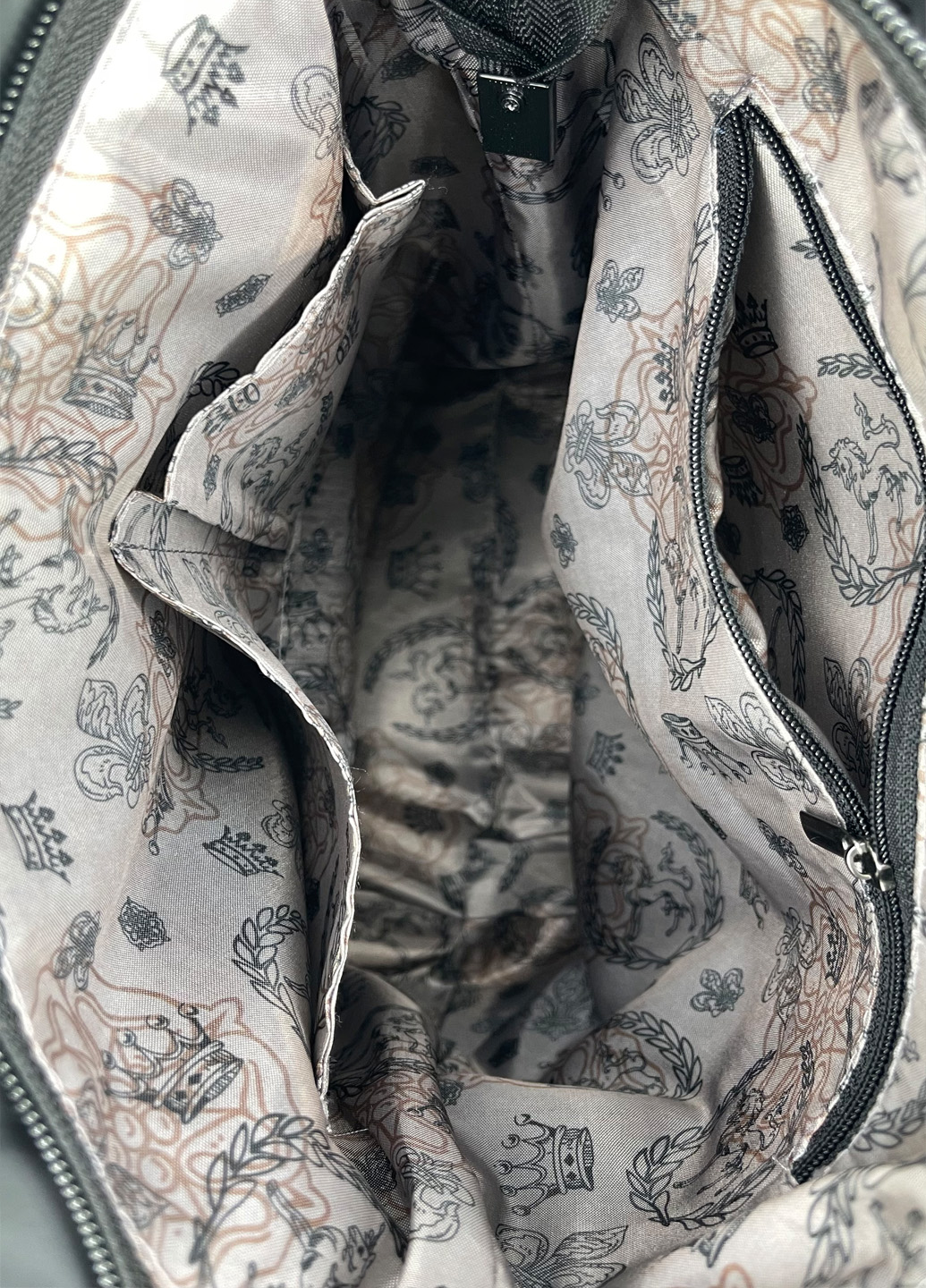 Усередині на підкладі одна прорізна кишеня на блискавці і дві накладні кишені без застібок.