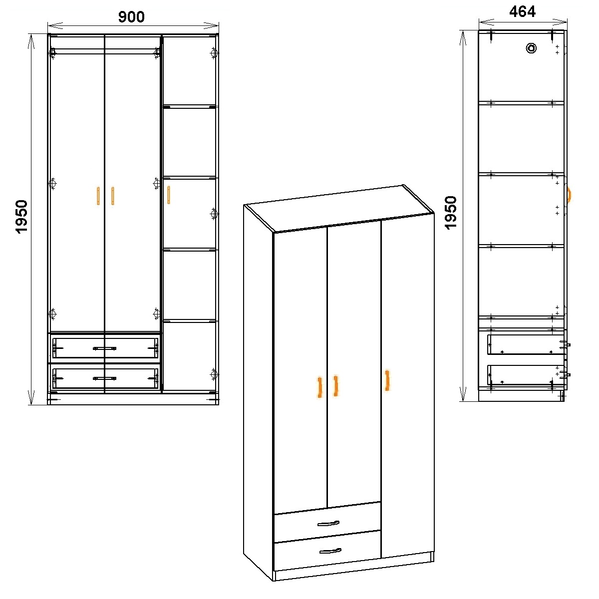 Шафа розстібна з ящиками Шафа-13 виготовлена ​​з ламінованого ДСП товщиною 16 мм. Шафа містить три розстібні двері і два зовнішні висувні ящики. Внутрішнє наповнення лівого відсіку – штанга для речей, правого – чотири полиці для одягу. Така модель стане оптимальним місцем для зберігання речей, текстилю, білизни та інших необхідних предметів одягу та побуту. Подібна шафа стильна, комфортна і зручна у щоденному використанні.
