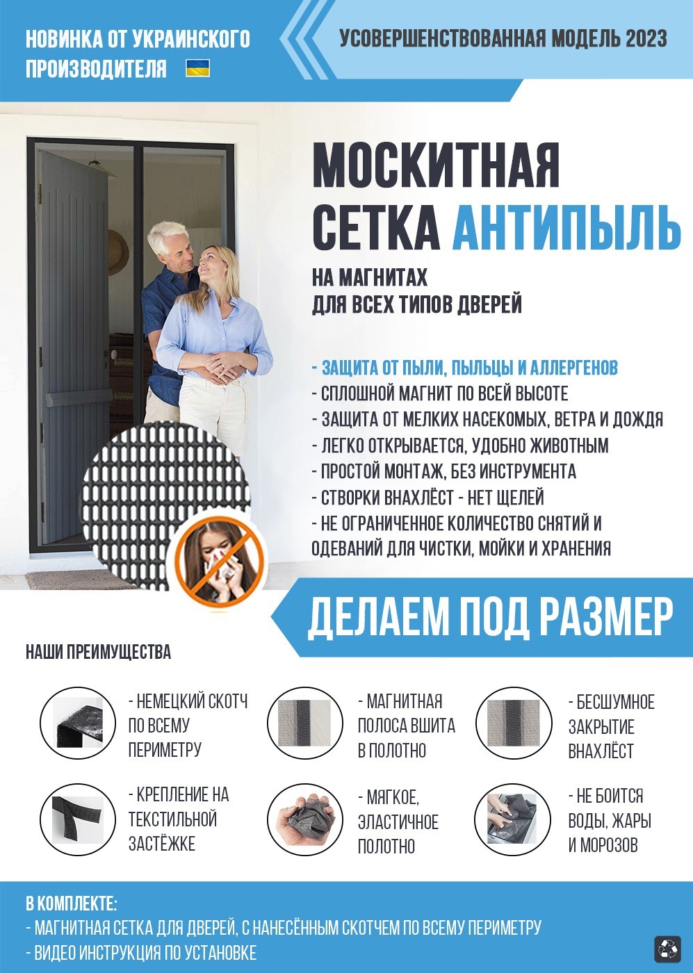 КомплектацияМоскитная сетка (2 створки), Лента липучка для установки (с нанесённым немецким скотчем), Видео инструкция по установке