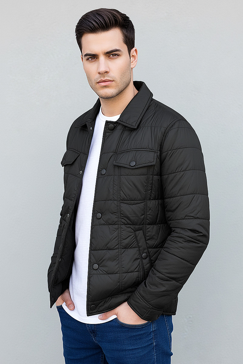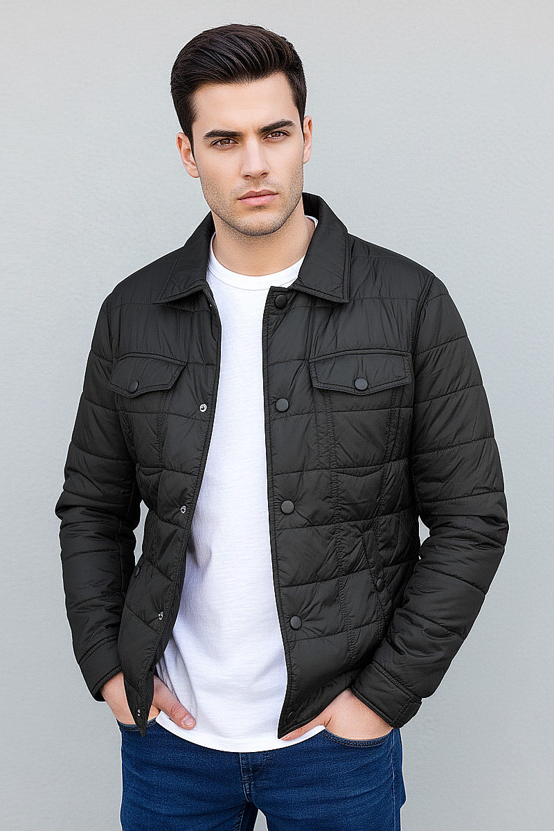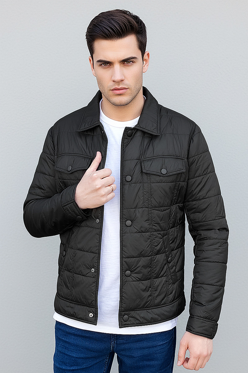 Чоловіча легка куртка AS-S-114 у чорному кольорі - стильна та практична модель для міжсезоння. Куртка універсальна та ідеально поєднується з різними образами – від джинсів з футболкою до класичних штанів із сорочкою. Модель застібається на кнопки та оснащена 5 зручними кишенями.